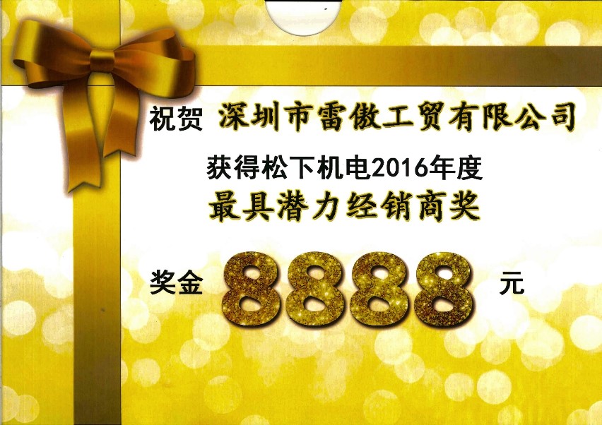 2016年4月23-24日,松下电器机电(中国)有限公司2015年度中国区经销商大会在上海世贸佘山艾美酒店隆重召开,我公司获得“最具潜力经销商"的光荣称号和8888元的奖金,集团董事长雷先生代表公司登台领奖。